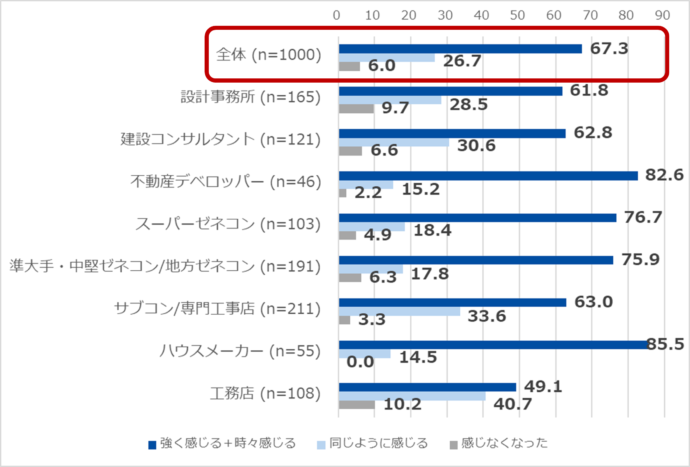 - 一方で、「法律施行以前よりも現場で人手不足を実感することはあるか」は、全体で67.3%が実感。中でも「スーパーゼネコン(76.7%)」「準大手・中堅ゼネコン/地方ゼネコン(75.9%)」「サブコン/専門工事店(63.0%)」と現場に近い業種ではより深刻化している。