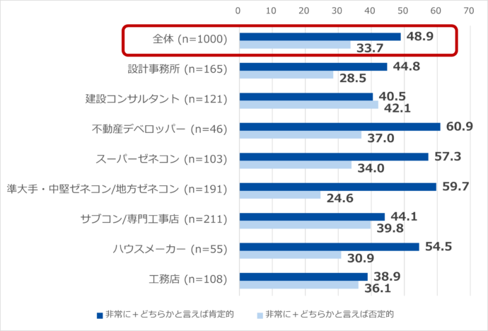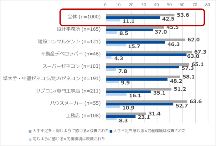 - 「労働環境は改善した」と「人手不足を感じる」を掛け合わせると、全体平均で53.6%を占める。中でも「スーパーゼネコン(65.1%)」「準大手・中堅ゼネコン/地方ゼネコン(58.1%)」と平均を上回る。「サブコン/専門工事店(51.2%)」と平均をやや下回った。 「人手不足を感じる×環境改善された」の裏には、人手は足りていないものの長時間労働を強いることもできないなかでいかに現場を回していくべきか、という現場関係者の苦悩がにじむ。