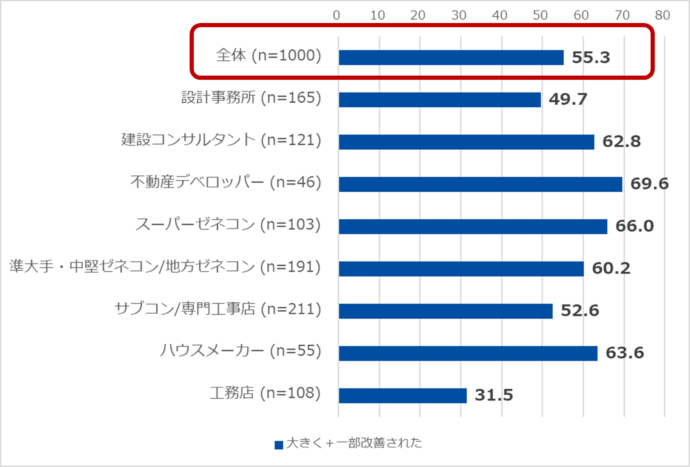 - 「残業時間上限規制が施行され、現場の労働環境(休日・残業・安全)は改善されてきたか」は全体で55.3%が実感。内訳として「スーパーゼネコン(66.0%)」「準大手・中堅ゼネコン/地方ゼネコン(60.2%)」「サブコン/専門工事店(52.6%)」と現場の労働環境改善の成果がでている。