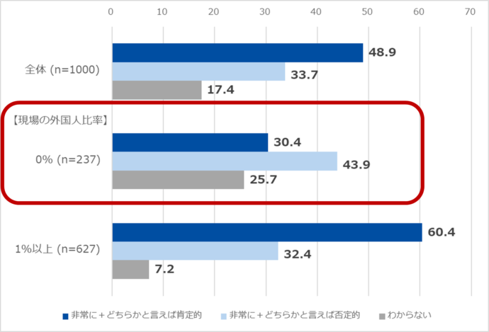 建設業界の人手不足解消策として注目される「外国人労働者の受け入れ」について、調査では全体で肯定的48.9%、否定的33.7%と、肯定派が優勢でした。しかし、「外国人従業員の在籍有無」と掛け合わせると、 外国人従業員がいない事業所では否定的が高い数値となっています。