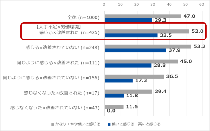 <2-2.「現場で人手不足を実感する・しない」「現場の労働環境(休日・残業・安全)は改善された・されていない」と、「賃金水準について他産業と比較」の掛け合わせ>