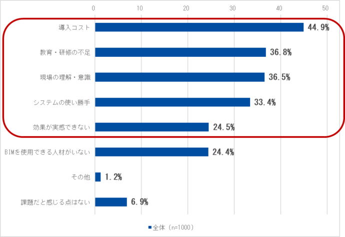 ④BIM導入の課題:導入コスト44.9%、教育・研修不足36.8%、現場理解36.5%、使い勝手33.4%、効果が実感できない24.5% → [調査③)]