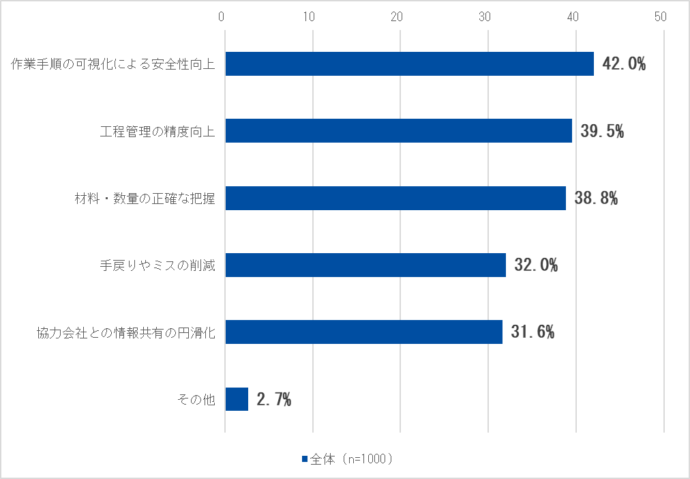 - 施工BIMの主なメリット(複数回答):1位作業手順の可視化による安全性向上42.0%、2位工程・作業効率41.9%、3位情報共有の円滑化44.0%、4位手戻り・ミスの削減32.0%。[調査③]